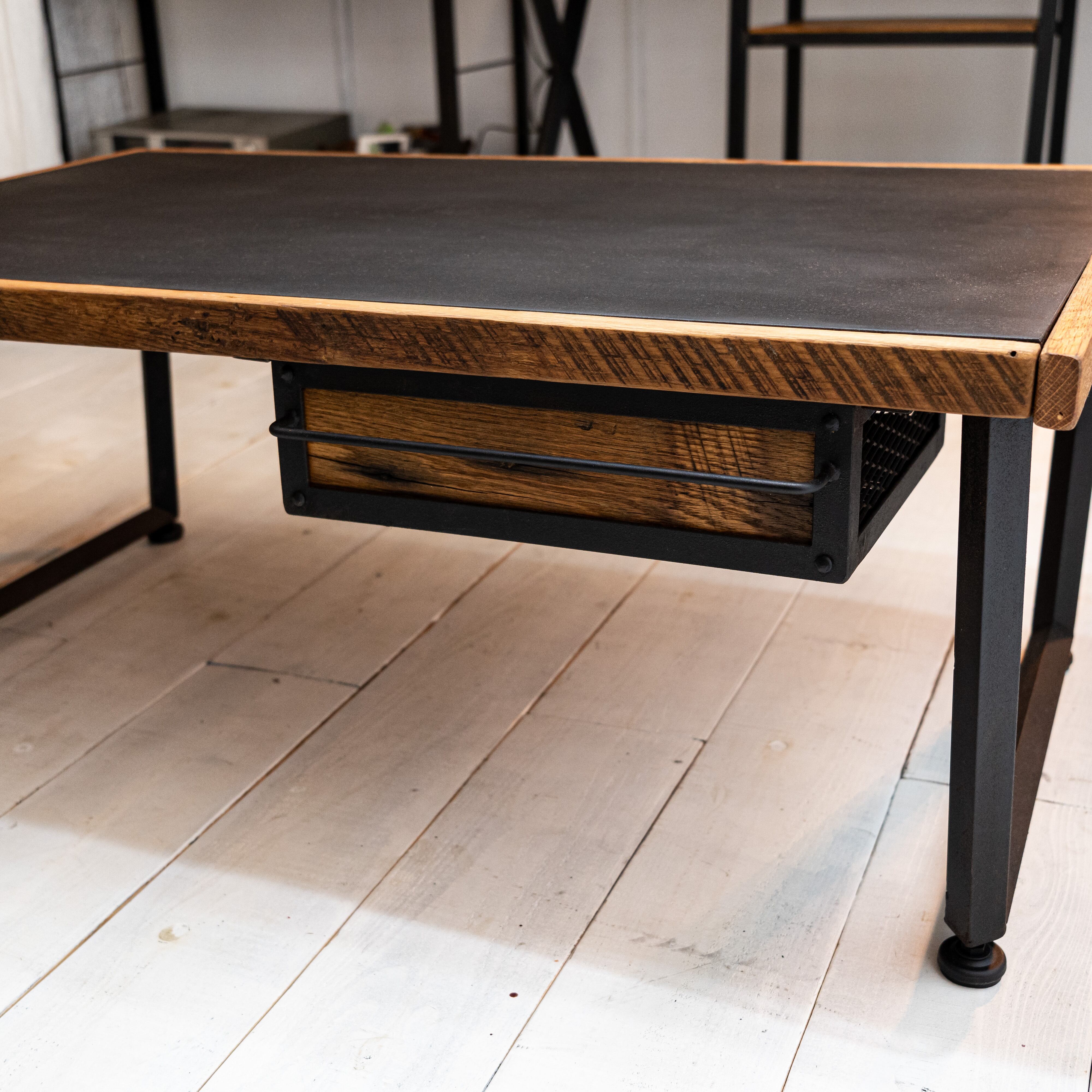 使い込まれた風合いのオーク古材が、重厚な鉄板を縁取り、ヴィンテージ感とインダストリアルな雰囲気を演出します。天板には撥水加工が施されており、日々のお手入れも簡単。水拭きが可能です。